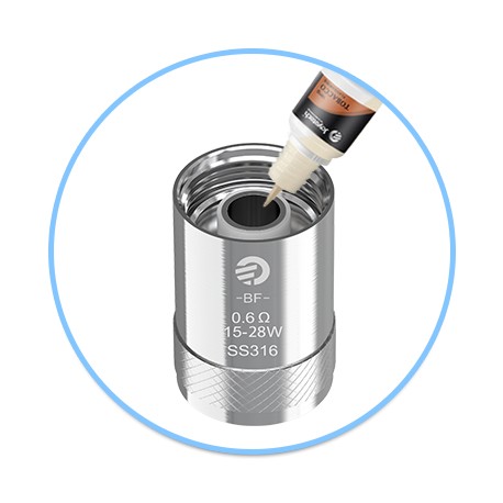 Avant toute première utilisation, versez quelques gouttes de e-liquide directement dans la résistance. Une fois installée, remplissez le réservoir et patientez 5 à 10 minutes pour que le coton soit bien imbibé (amorcage). Utilisez de préférence des e-liquides fluides (PG/VG 50/50).